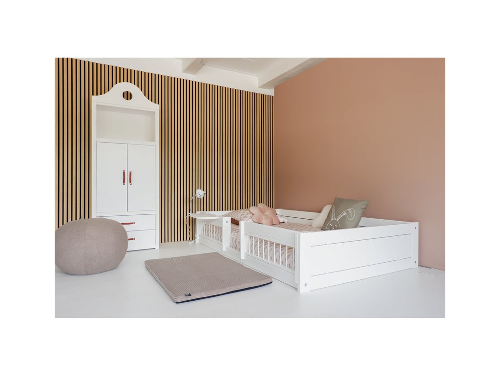 Postel můžete kombinovat s originálním závěsným příslušenstvím LIFETIME nebo přidat sadu zásuvek 105-10 a vytvořit tak úložný prostor, který uzavře prostor pod postelí. Postel LIFETIME Montessori je k dispozici v bílém laku.